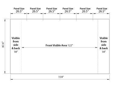 | Booth Technical Specifications | Overall Height: is 87.6" (2225mm) with 6 equal width panels measuring 26.5" (673mm). You should create your mural as a single file with a total width of 159" (4038mm) by 87.6" (2225mm) in height. Remember to reserve the outside 18" (left and right sides) for endcaps that wrap around to the back. We recommend that you continue your background treatment but not any text or logos in this outside area. Shipping Weight: 65 pounds. Note that some products ship on "dimensional weight" which is based on size not actual weight.